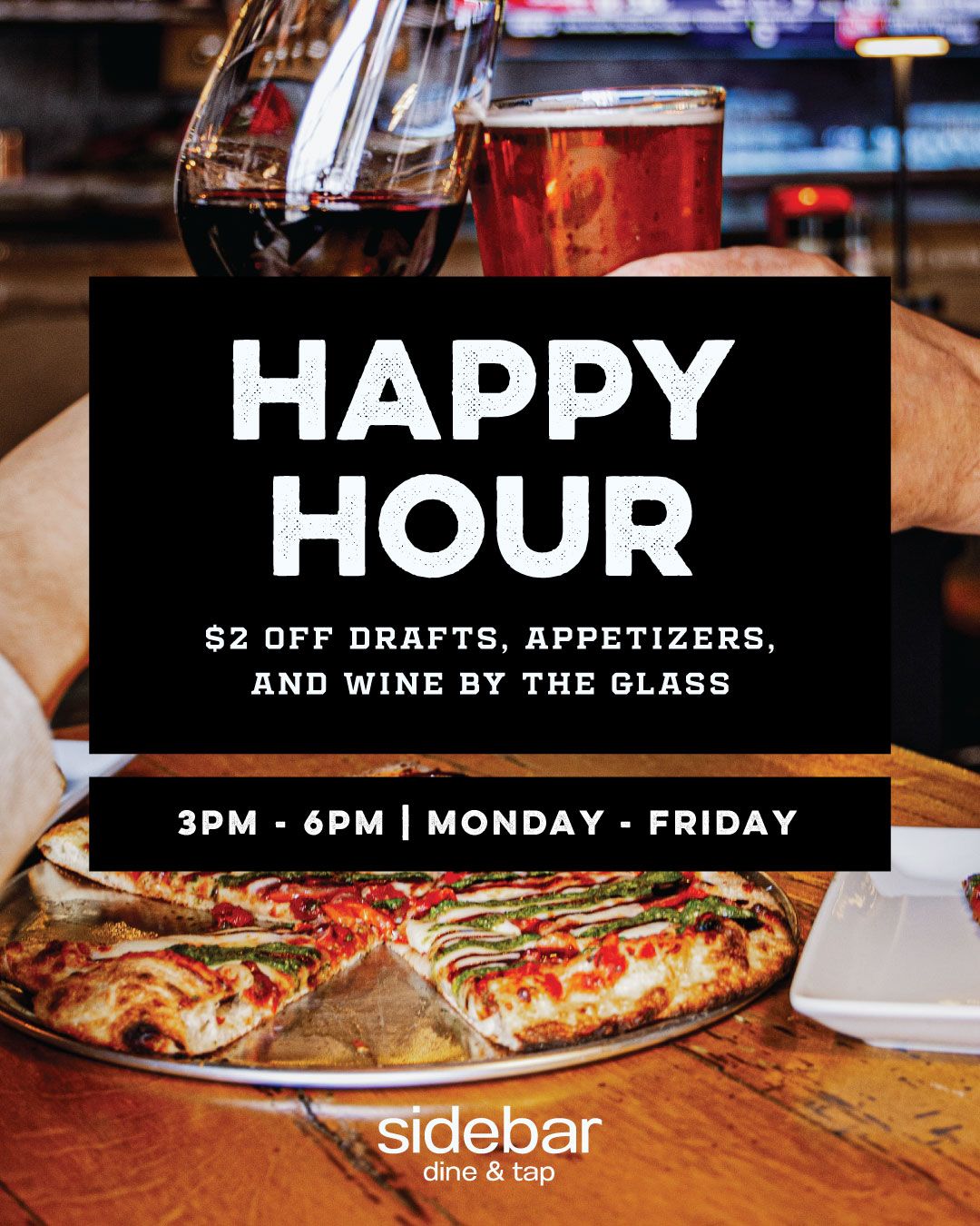 $2 off Drafts, Appetizers, and Wine by the Glass" 3PM - 6PM | Monday - Friday
